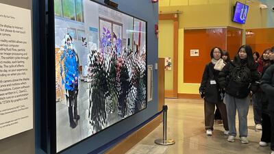 途中立ち寄った「バナナラウンジ」では、学生たちが無料のバナナを食べながらゴロゴロしたり、勉強していて、「勉強道具と健康と炭水化物と息抜きが揃う」まさにMITらしい空間です。(私たちもご相伴にあずかりました)さらに、キャンパスのビルを巨大スクリーンに見立ててテトリスを落とし込んだ“ハック文化”の説明もしてくださいました。MITでは、学生が知識と技術でユーモアあふれるイタズラをする伝統があり、「遊び心と実行力が世界を変える」というメッセージのようにも感じられます。