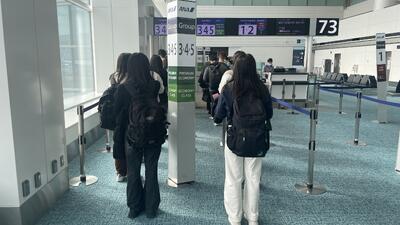 バスが走り出すころ、東の空がゆっくり色づき始めます。黒から藍、そして透き通るようなオレンジへと移ろうグラデーションは、まるでこれから始まる冒険を祝福しているかのようでした。羽田空港第二ターミナルに到着後、スーツケースを持ってチェックインに進みます。一人ひとりパスポートを手に機械の前で操作をし、搭乗券と荷物タグを印刷。スーツケースを預けるところまで、すべて自動化されています。ANAのスタッフの方は近くに待機されているので困った時は尋ねることはできますが、基本的にはモニターの指示に従って必要事項を入力していきます。少し手間取るかな?と思いましたが、やはり渋女生!お互いに助け合いながら無事に保安検査へ進むことができました。昼の便ということもあり、機内ではしばらく賑やかに談笑が続きました。「寝たら時差ボケこわい〜」と言いながら映画を見続ける生徒、イヤホンを片耳だけつけて友人と小声で話し込む生徒……。この時は楽しそうで良かったのですが、後に体力を削る伏線になるとは誰も気づいていません。